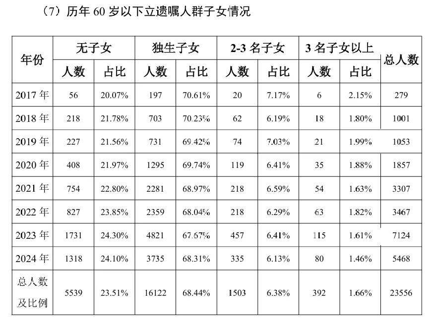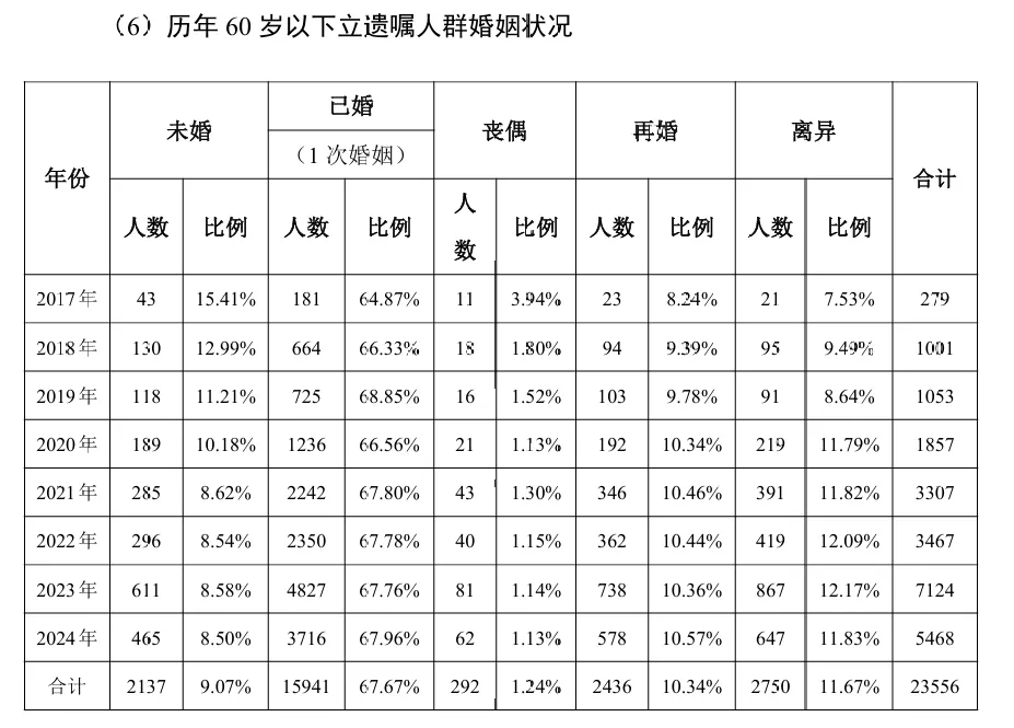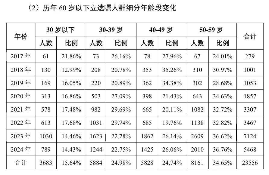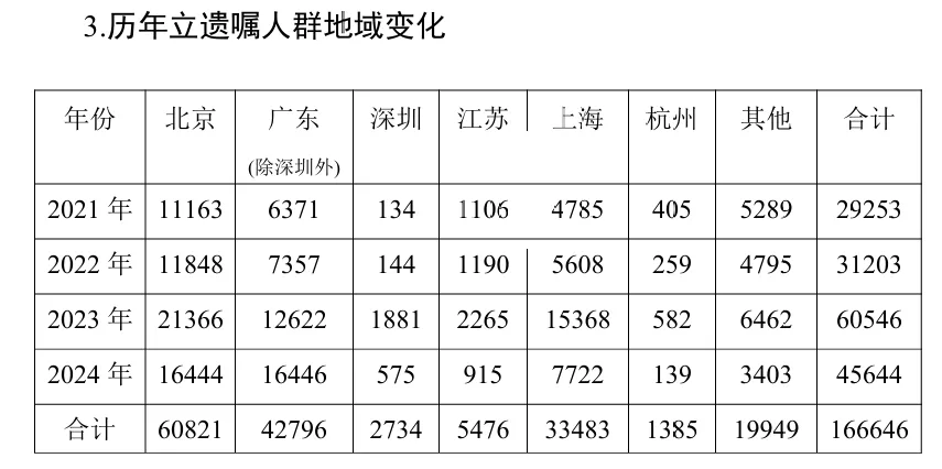 2021 年至2024 年,北京地区立遗嘱共计60821份,上海地区立遗嘱共计33483 份,广东地区(除深圳外)立遗嘱共计42796份,三个地区加起来的遗嘱量占比超全国总遗嘱量的82%。从以上数据可知,立遗嘱人群的区域以北上广为主要的地区,其它城市数据稍低。