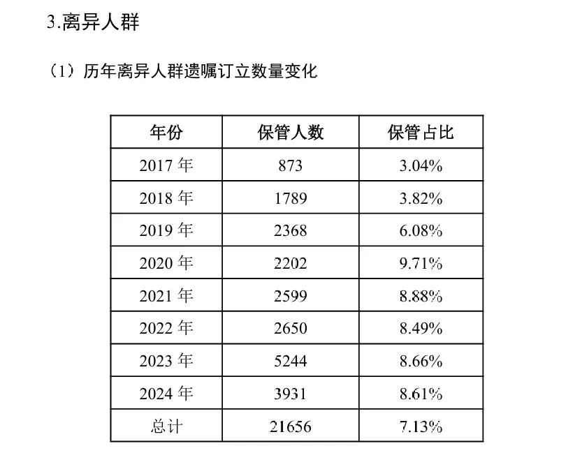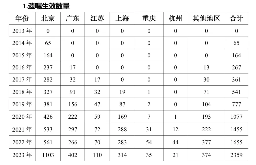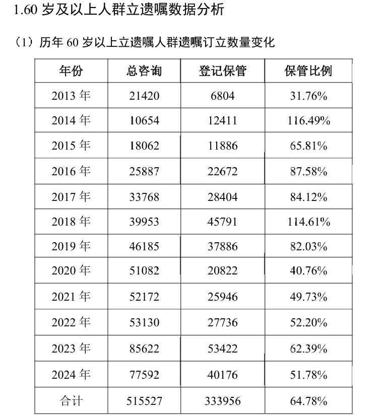 据统计,2013—2024年在中华遗嘱库生效的遗嘱共计12261份,数据显示,在中华遗嘱库保管的遗嘱,生效数量每年均在上涨。