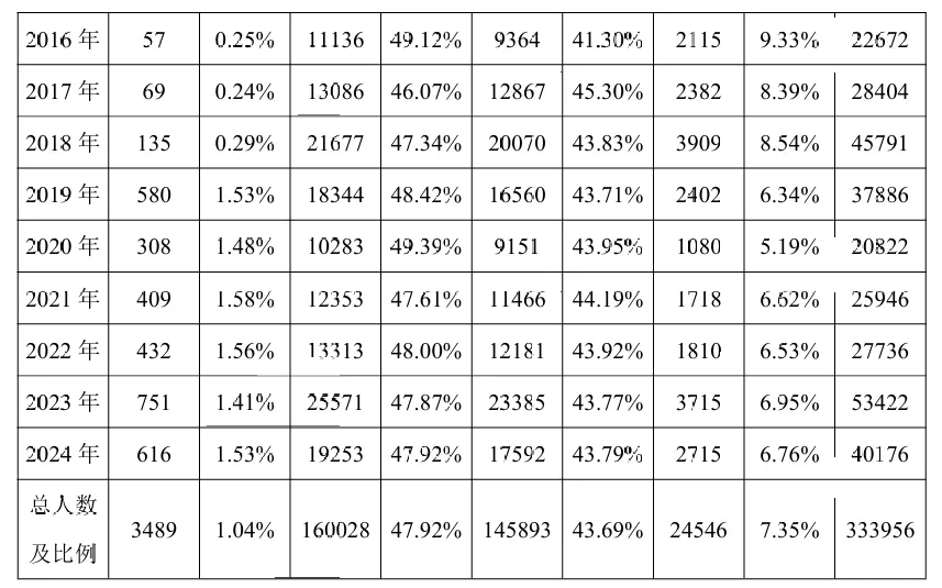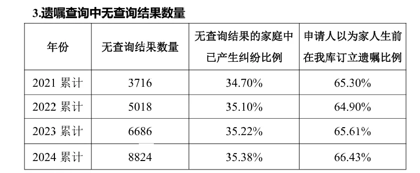 无查询结果的数量逐年增加,原因是遗嘱查询申请人中认为家人生前在中华遗嘱库订立遗嘱的占比较高,累计至2024年占比已经高达66.43%。