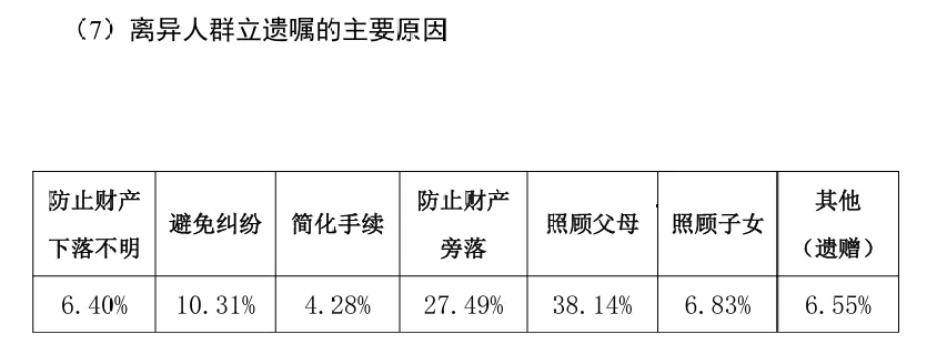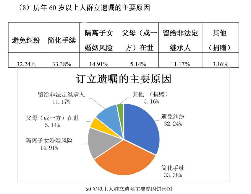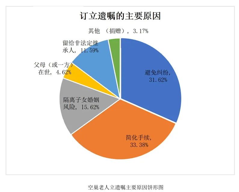 大部分人群订立遗嘱的原因是为了避免纠纷和简化手续,比例分别为32.24%和33.38%;其次,隔离子女婚姻风险的比例仍然不在少数,比例达14.91%;将财产留给非法定继承人比例达11.17%,非法定继承人多指孙辈。