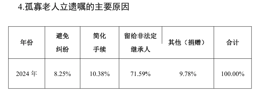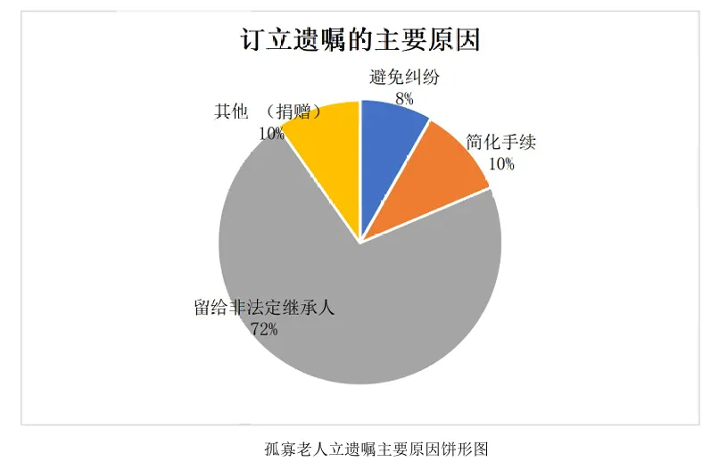 孤寡老人中大部分人群订立遗嘱的原因是为了留给非法定继承人和简化手续,比例分别为71.59%和10.38%;其他(捐赠)比例排第三,比例达9.78%;最后是为了避免纠纷,比例达8.25%。