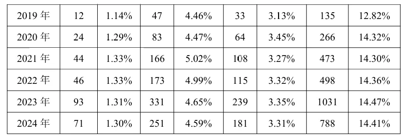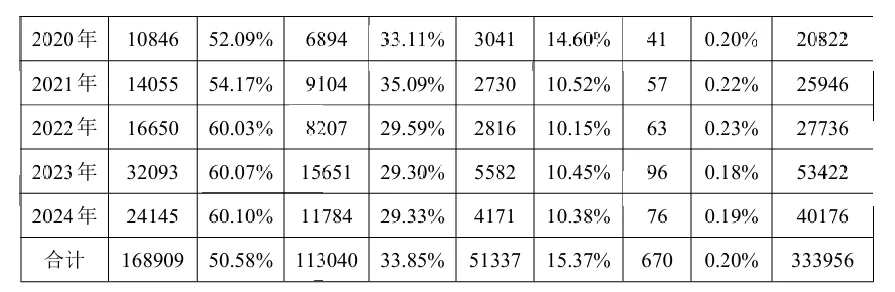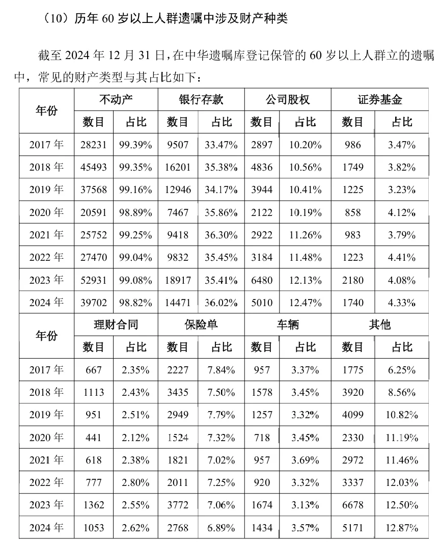 2017—2024 年间,遗嘱中处理财产以不动产为主,2024年占比达98.82%,其次为银行存款,占比36.02%。根据统计,遗嘱中处理的其他财产(古董、字画、收藏品、贵重物品等)的多样性与数量有所增加。