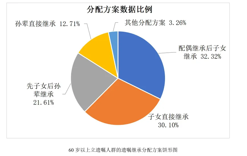 2013—2024 年间,遗嘱中所涉及的继承人多为配偶或子女;数据表明“子女直接继承”和“配偶先继承,子女后继承”是主要的分配方案,占比共计62.42%。遗嘱继承人除了配偶、子女以外,孙辈也属于遗嘱继承人之一,由孙辈直接继承占比12.71%。