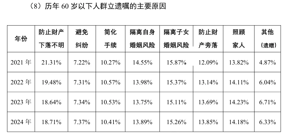 历年离异人群立遗嘱的主要原因多样,“避免纠纷”也占据一定比例。整体来看,离异人群立遗嘱的动机主要集中在家庭责任、财产安全和个人意愿的表达上。