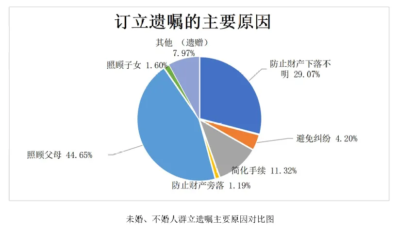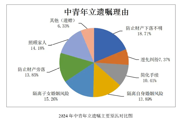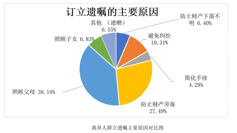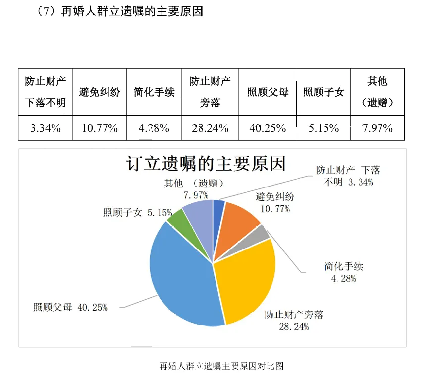 再婚人群立遗嘱的主要原因多样,其中“照顾父母”是最主要的原因,占比高达40.25%,显示出再婚人群对父母未来生活的深切关怀。“防止财产旁落”也是立遗嘱的重要原因之一,占比28.24%,这反映出再婚人群希望确保自己的财产能够按照个人意愿进行分配,避免不必要的流失。