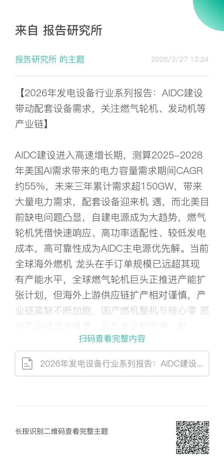 海外数据中心建设带动燃气轮机需求,多个人工智能巨头纷纷采用燃气轮机作为电力供应源。国内电网基础设施完善,AIDC主用电源 为外部电网供电,美国电网老化,新增发电容量并网延迟,超50%区域存在缺电风险。在此背景下,美国AIDC主用电源通常采用燃气轮 机发电,如xAI、Google、Meta、Crusoe AI等人工智能巨头纷纷订购燃气轮机来进行AIDC建设;西门子、GE Vernova、贝克休斯等燃气 轮机供应商也纷纷斩获数据中心客户订单。