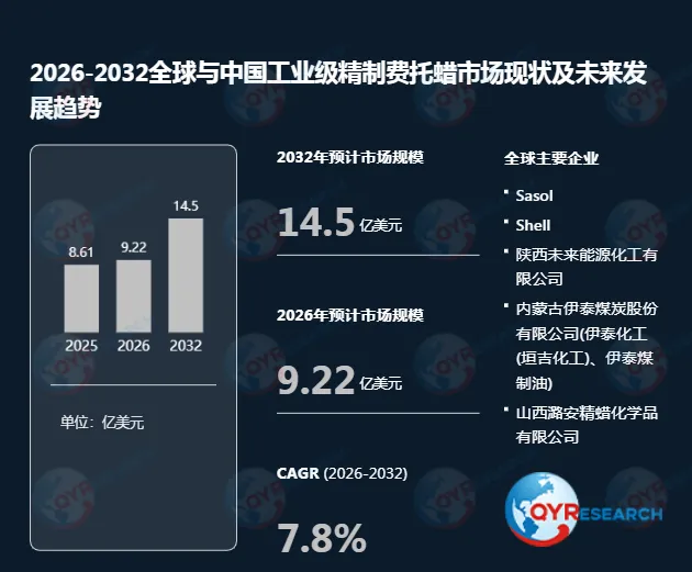 根据QYR(恒州博智)的统计及预测,2025年全球工业级精制费托蜡市场销售额达到了8.61亿美元,预计2032年将达到14.5亿美元,年复合增长率(CAGR)为7.8%(2026-2032)。