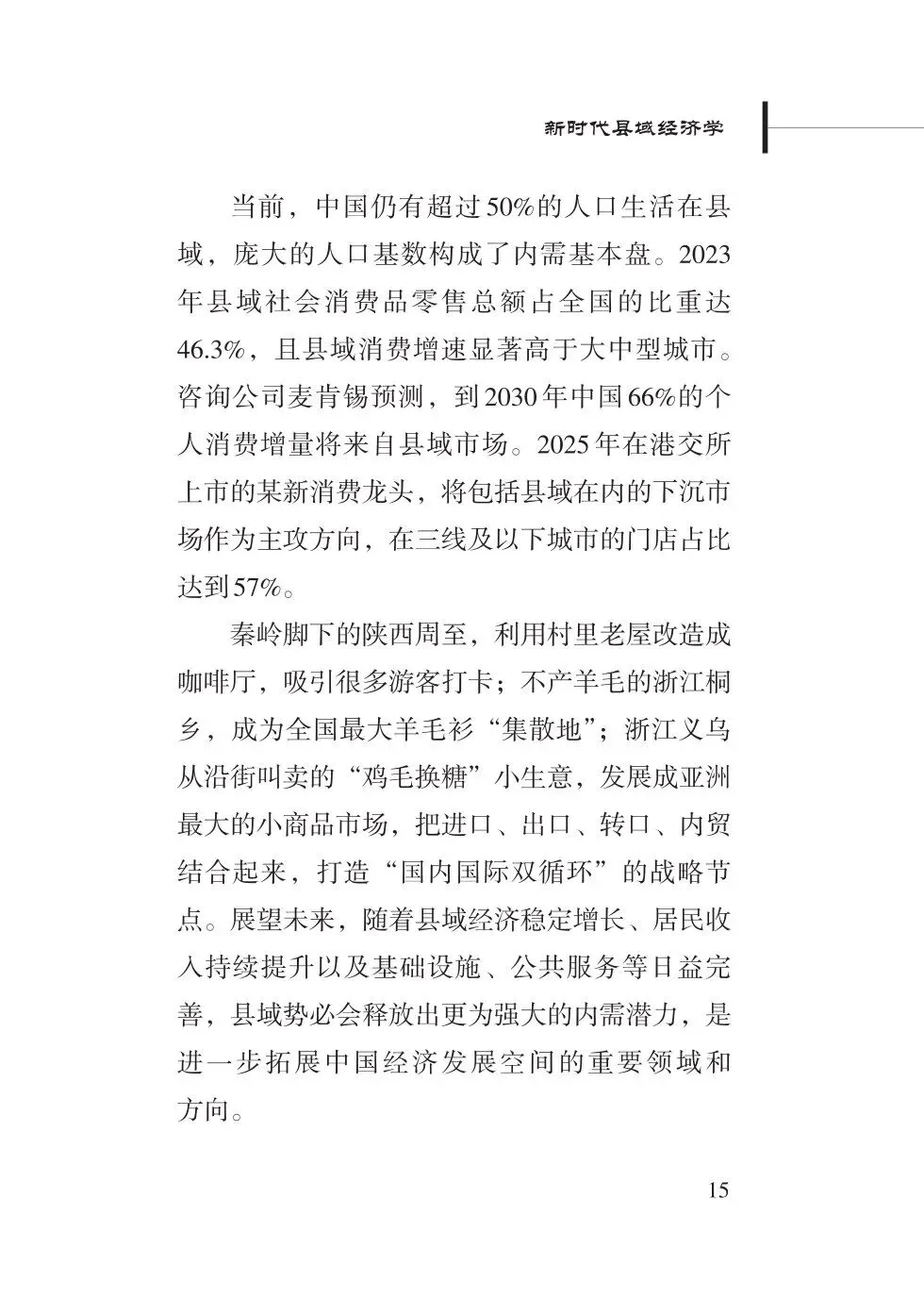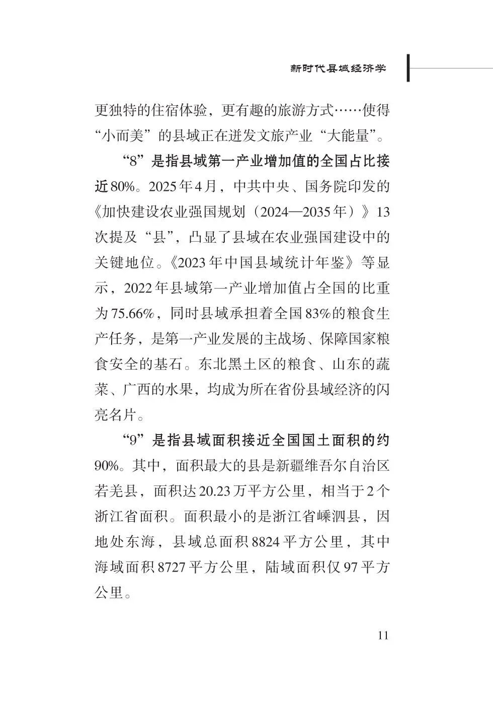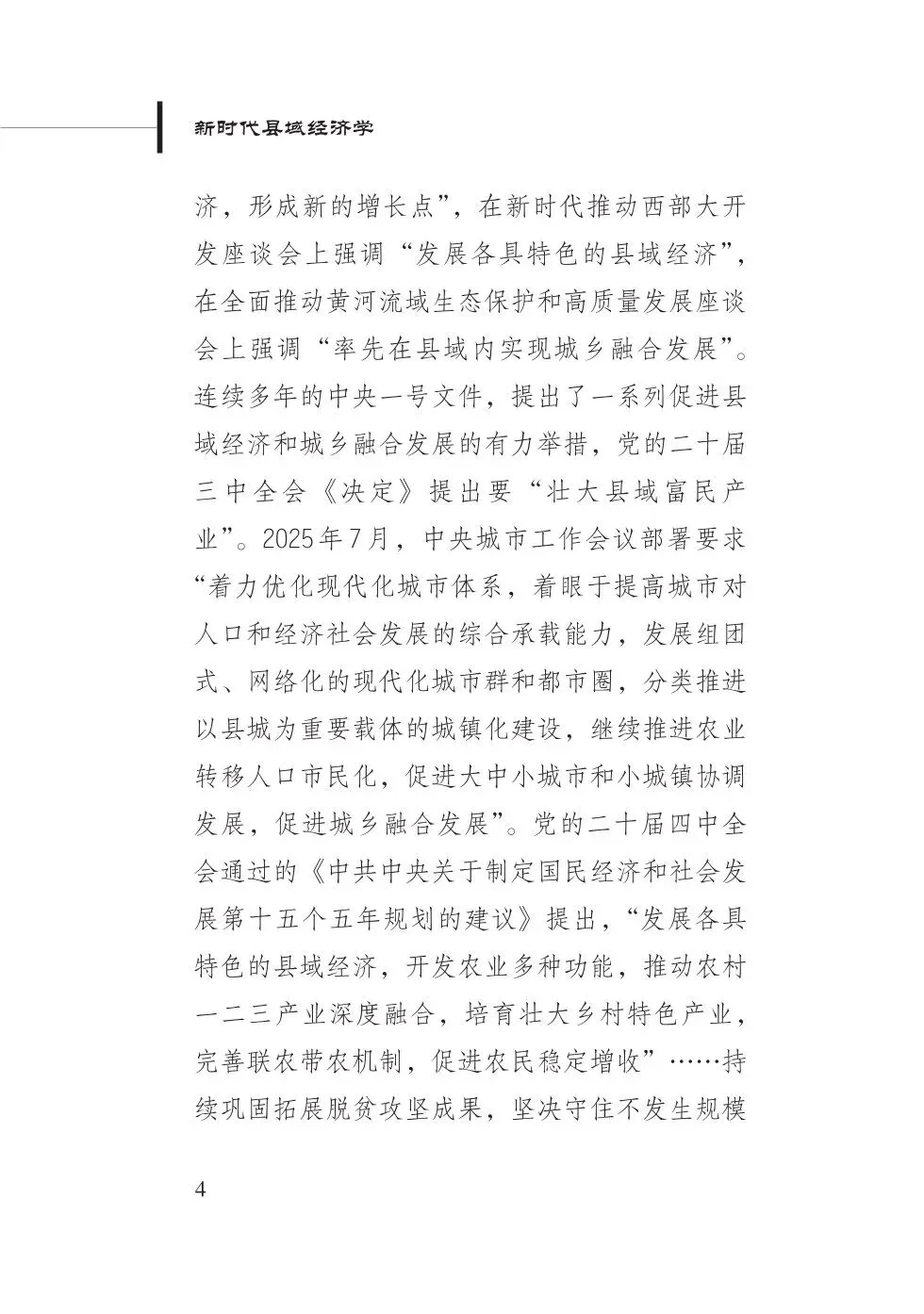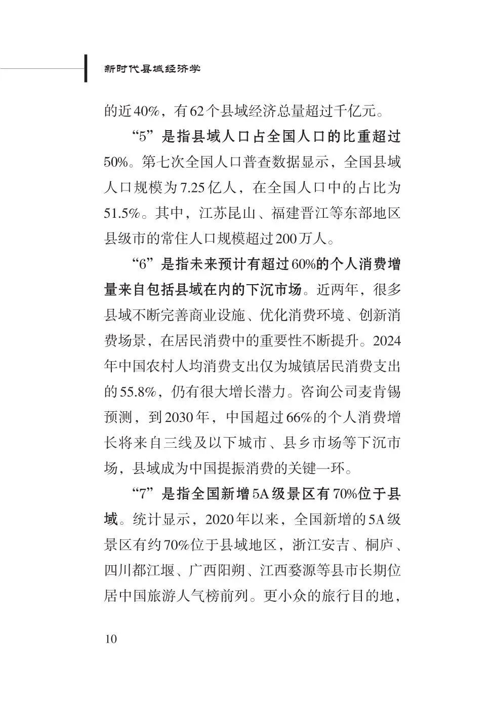 :县域占全国国土面积 90%、人口 51.5%,贡献近 40% GDP,是经济高质量发展的重要支撑、城市群都市圈的重要腹地、扩大内需的关键空间。2024 年县域社会消费品零售总额占全国 46.3%,预计 2030 年 66% 个人消费增量来自县域,在粮食安全、生态保护、城乡融合中发挥 “压舱石” 作用。 - 核心内涵聚焦五大关键维度