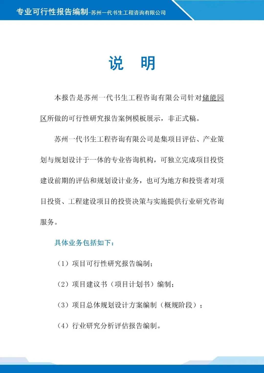 项目可行性研究报告代编、项目可行性报告编制,请联系:17312436919。本可行性报告由苏州一代书生工程咨询有限公司编制,立足储能产业发展趋势,围绕全产业链园区建设核心,明确三大编制要点,确保报告科学严谨、贴合实际。其一,编制基础:依据权威,数据扎实。严格遵循《新型储能规模化建设专项行动方案(2025—2027年)》等政策要求,整合国家能源局等官方数据,结合储能产业头部企业布局案例及园区实地调研结果,兼顾政策导向与产业实际,确保编制内容有依可据、真实可信。其二,核心聚焦:靶向精准,重点突出。聚焦储能全产业链布局,重点分析园区选址合理性、上下游产业配套、技术路线适配性,剖析长时储能等核心领域潜力,预判园区建设规模、产能效益及产业集聚效应,紧扣项目建设核心痛点与可行性关键点。其三,编制导向:立足实用,赋能落地。以项目立项、政企决策、落地实施为核心导向,规避冗余表述,提炼技术、经济、环境等维度的可行性结论与实操建议,兼顾专业性与实用性,为项目合规建设、风险规避、效益提升提供精准支撑。产业规划咨询、概念规划设计