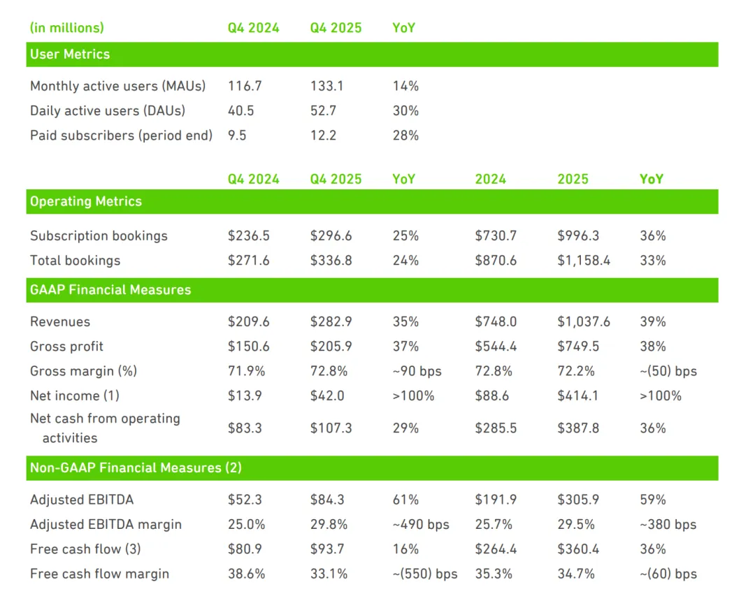 2月26日,多邻国(NASDAQ:DUOL)公布了2025年第四季度及全年业绩,并宣布了一项4亿美元的股票回购计划。多邻国2025年第四季度营收2.829亿美元,同比增长35%,经调整EBITDA(息税折旧摊销前利润)为8430万美元。