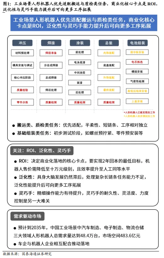 人形机器人优先适配搬运与质检类任务,并向基础组装拓展,商业化核心卡点是ROI,仍需降本提效,自主泛化能力提升后可向更多工序拓展。以汽车制造和电池组装产线为例拆解工作流程,分析工序步骤,人形机器人将优先胜任搬运类、质检类任务。这些任务普遍具有半柔性特征,人工参与度高,尚未被传统自动化设备全面替代;另一方面又具备短链条、工序相对独立的特征,在具身大脑的发展现状下人形机器人能够胜任;对于基础组装类任务,如螺丝预拧紧、零件预安装、车标安装、线束插接等基础装配步骤,人形机器人在初步测试阶段。ROI 决定商业化落地,要实现 2 年回本的最低目标,机器人售价需降低至十万元级别,且效率提升至人工同等水平;为了提升效率,需要提升续航、节拍和耐久性。部分发达国家劳动力短缺、人力成本高,人形机器人的商业化闭环有望率先跑通,出海或将成为重要方向。具身大脑发展仍然滞后,处理复杂长链条任务能力不足,泛化性能提升后人形机器人可向更多工序拓展;精细操作能力有待提升,灵巧手的耐久度、灵活度、力度控制是从演示走向实用的另一大难关。