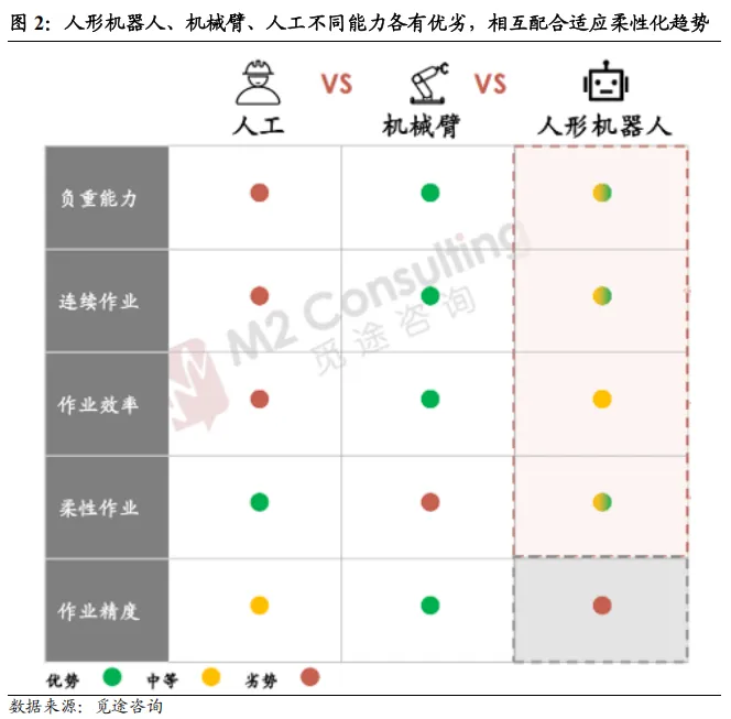 人形机器人与工业机器人的能力差异,体现了二者为互补而非替代关系。综合来看,人形机器人目前能够实现的性能特点介于人工和工业机器人之间:精度和负载不及工业机械臂,但胜在灵活通用,具备一定柔性能力。工业机器人依然是执行高精度、高刚性重复任务的最佳选择;而人形机器人则通过其灵活性去覆盖工业机器人与人工之间的衔接环节,最大价值不在于和机械臂拼速度、拼精度,而是在于发挥柔性和通用优势,在产线中打造人机协作、优势互补的智能生产体系。