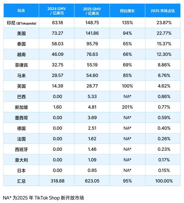 在全球电商整体增速明显放缓的背景下,真正具备确定性增长空间的平台已经不多。2025年,TikTok Shop 在全球15个站点预计实现 623.05亿美元GMV,同比增长 95.5%,增速约为行业平均水平的5倍,成为全球零售体系中增长最为迅猛的核心变量。