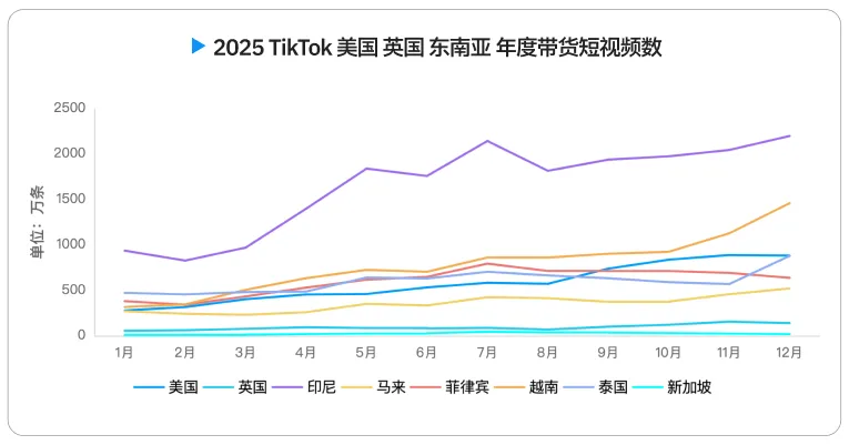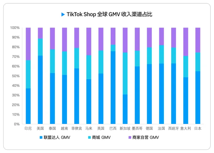 在达人内容成交形态层面,短视频依旧占据主导地位。以美国市场为例,达人短视频贡献约 81.85 亿美元 GMV,显著高于直播的 18.8 亿美元;在印尼等市场,达人视频的成交规模同样超出直播。这反映出在内容密集供给下,高频、可持续的视频内容比单场直播更能形成稳定、长期的成交结构。