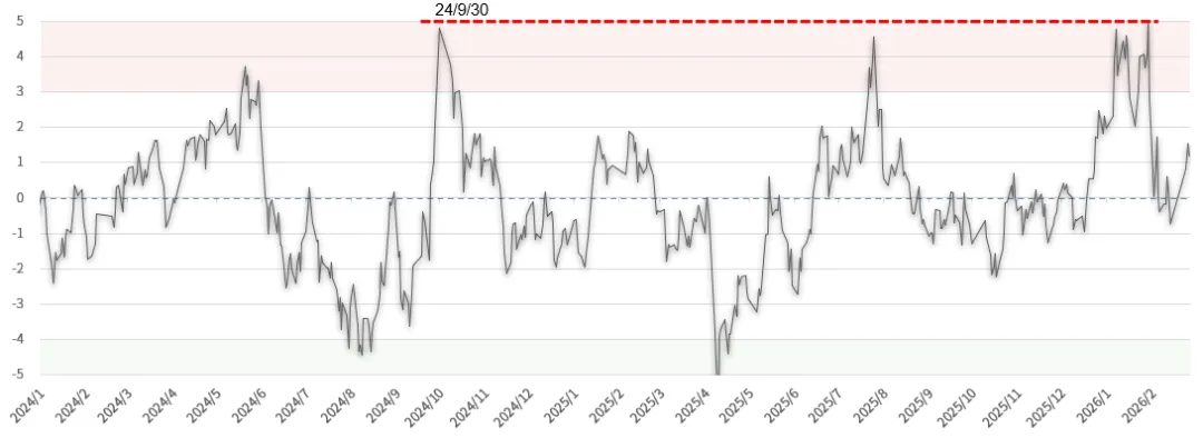 当情绪指数接近±4时,代表市场情绪过度乐观或过度悲观,商品容易形成顶部和底部。