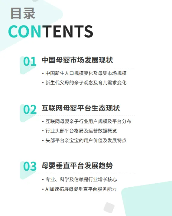 中国母婴市场规模与新生人口变化,看清行业大盘; 新生代父母的亲子观念与育儿痛点,精准触达用户; 互联网母婴平台生态格局,头部平台的运营数据与用户价值; 专业、科学、AI 赋能,成为母婴平台增长的核心密码。