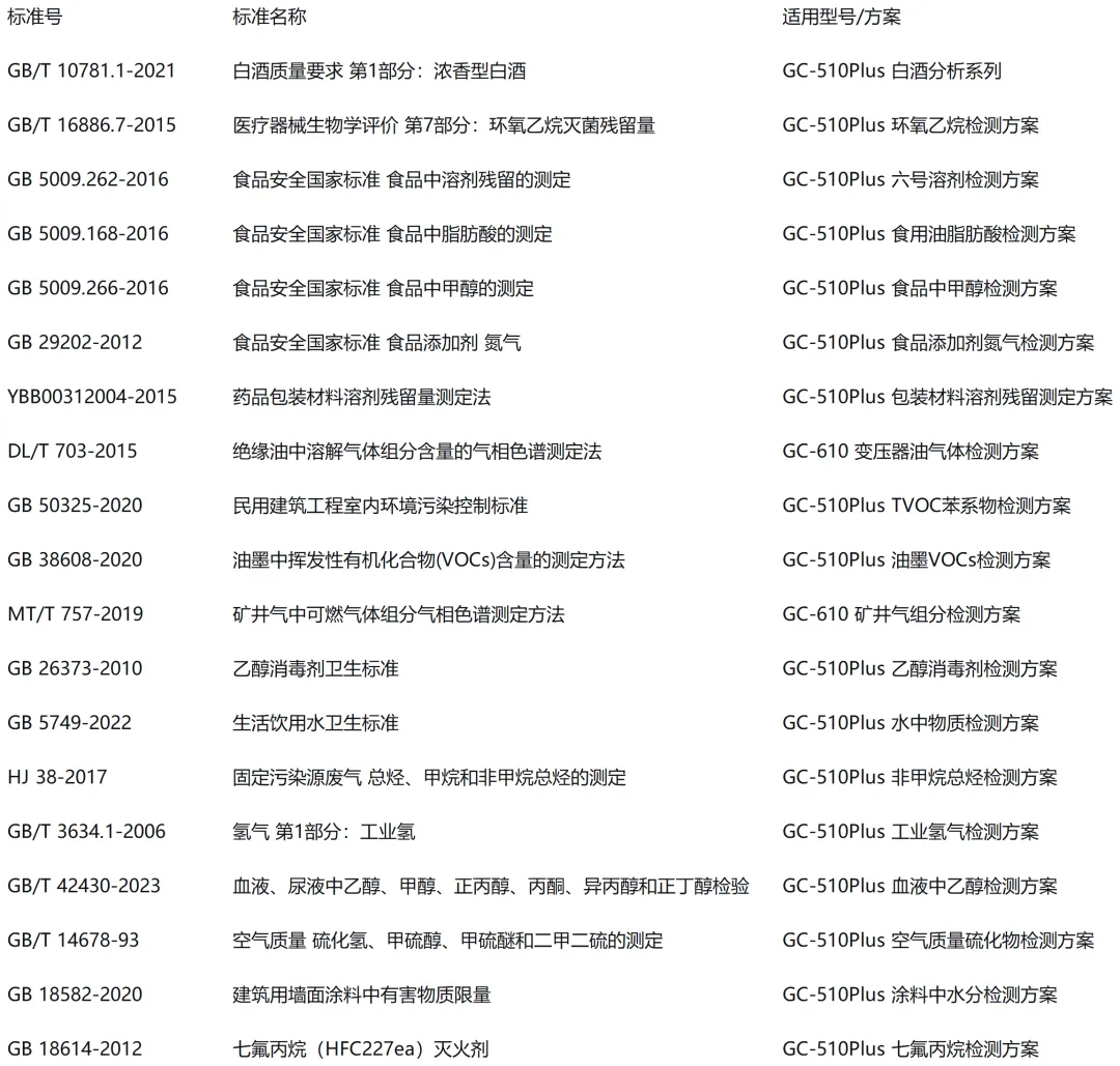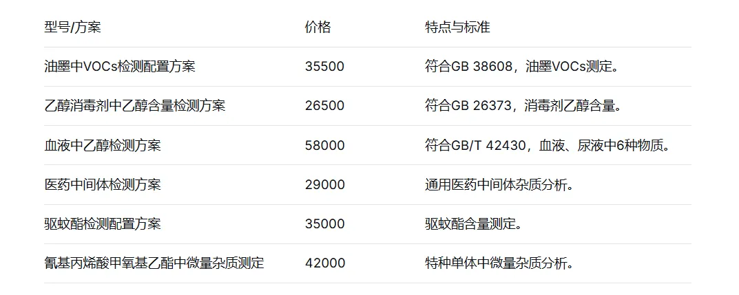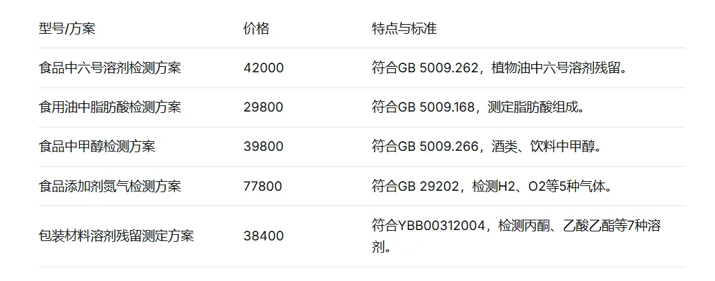 后缀(部分型号):方案描述,如“白酒分析23组分检测方案”、“环氧乙烷全自动顶空检测方案”等,体现专用配置。
