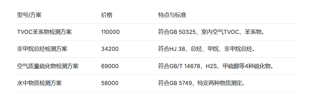 环境监测机构:TVOC苯系物方案(110000元)覆盖标准全项;非甲烷总烃方案(34200元)性价比高。