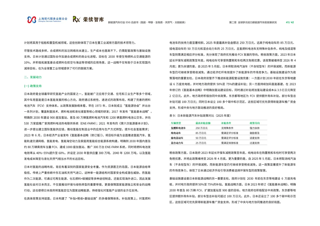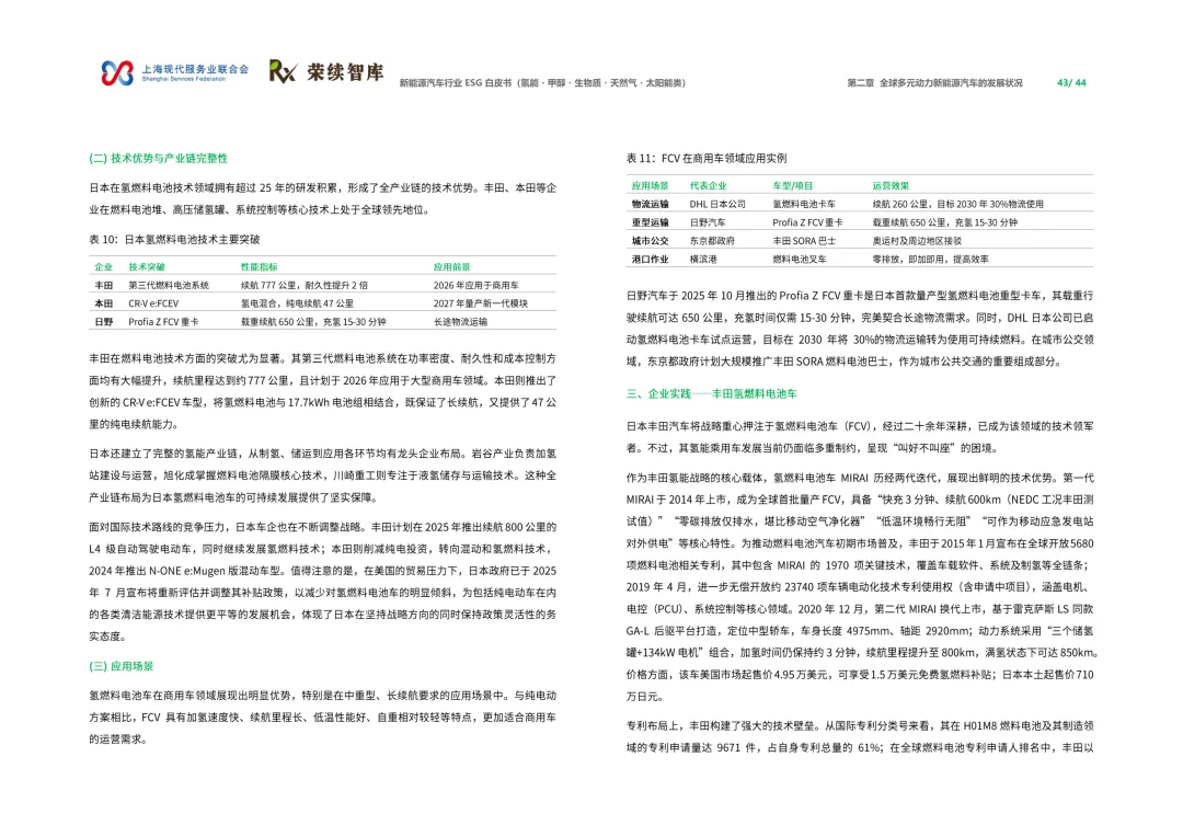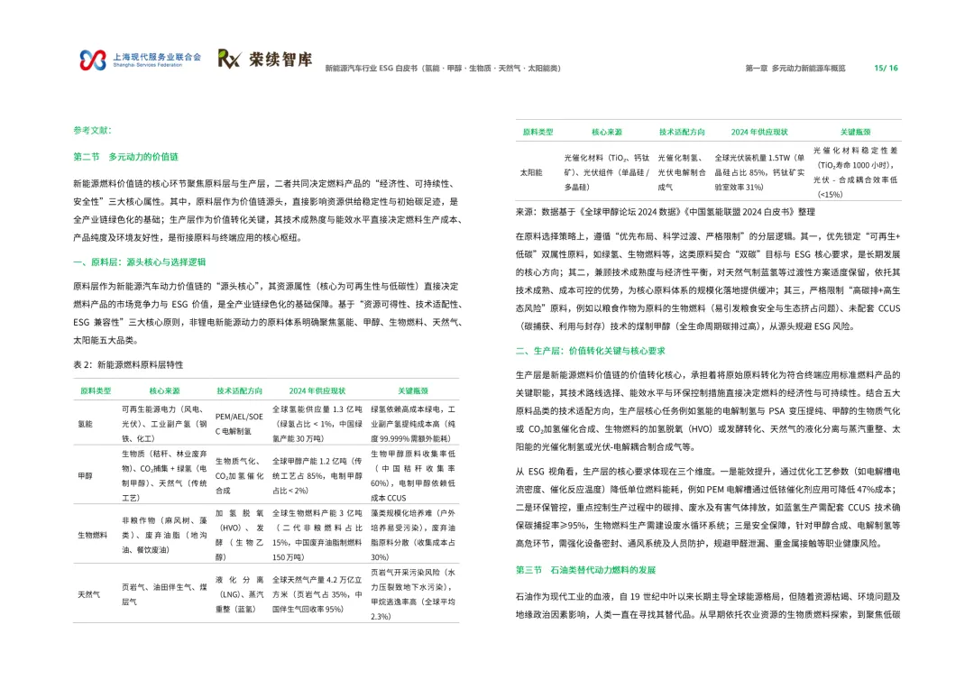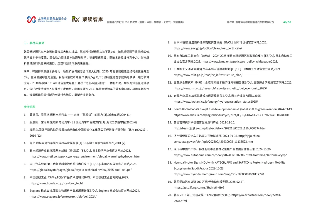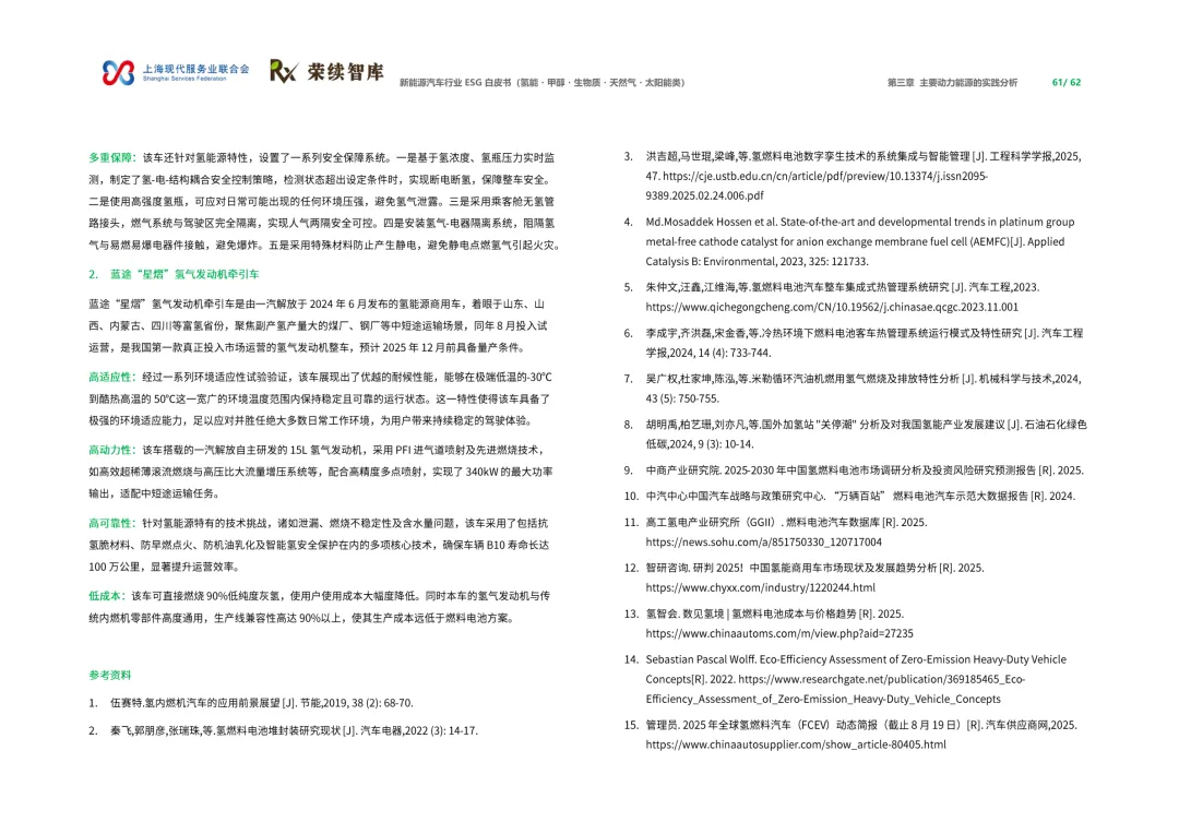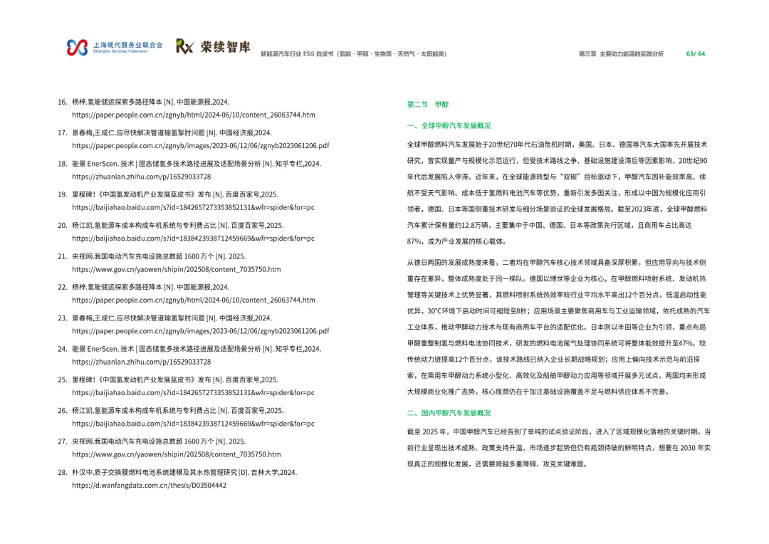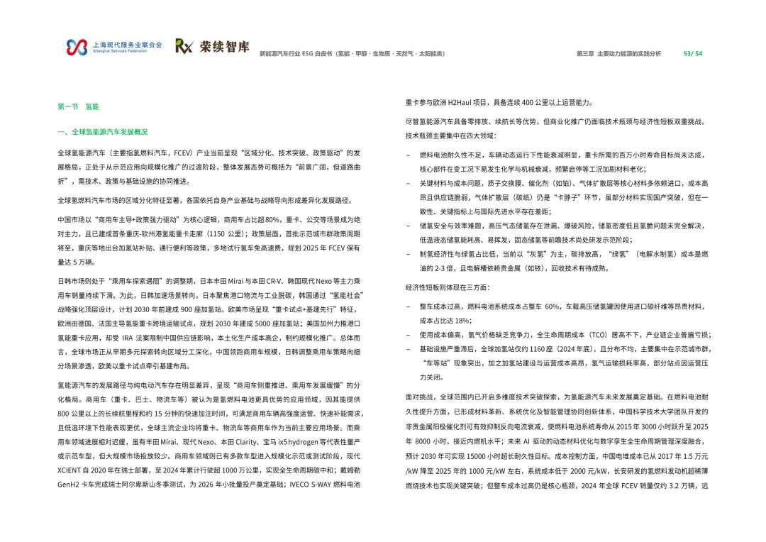报告聚焦多元动力技术路线,剖析氢能、甲醇、生物质、天然气、太阳能五类能源的 ESG 实践路径。白皮书指出,新能源汽车产业已从单一电动化转向多元能源共生,不同能源形态凭借独特优势适配差异化场景,共同支撑产业绿色转型。白皮书系统梳理各类能源的技术特性与产业进展,氢能主打零碳闭环与长续航优势,甲醇依托基础设施改造便利性快速推广,生物质燃料聚焦循环经济价值,天然气发挥过渡减排作用,太阳能凸显能源自主潜力。全球市场呈现区域分化特征,中国在商用车规模化应用领先,日韩侧重技术迭代,欧美聚焦重卡试点与基建布局。白皮书强调,产业发展需破解成本控制、基础设施建设、技术标准统一等核心挑战。通过政策引导、技术创新与产业链协同,多元动力路线将推动新能源汽车产业从规模扩张迈向高质量可持续发展,助力交通领域零碳目标实现。