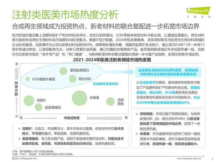 医美注射市场正经历从“填充时代”向“再生时代”的跨越。《中国注射类医美行业研究报告》显示,以重组胶原蛋白、聚左旋乳酸为首的合成生物材料已成资本新宠,占注射类投融资事件的60%。更值得关注的是,国产重组肉毒素临床进展迅速,有望改写由进口品牌主导的肉毒素市场格局,实现“弯道超车”。
