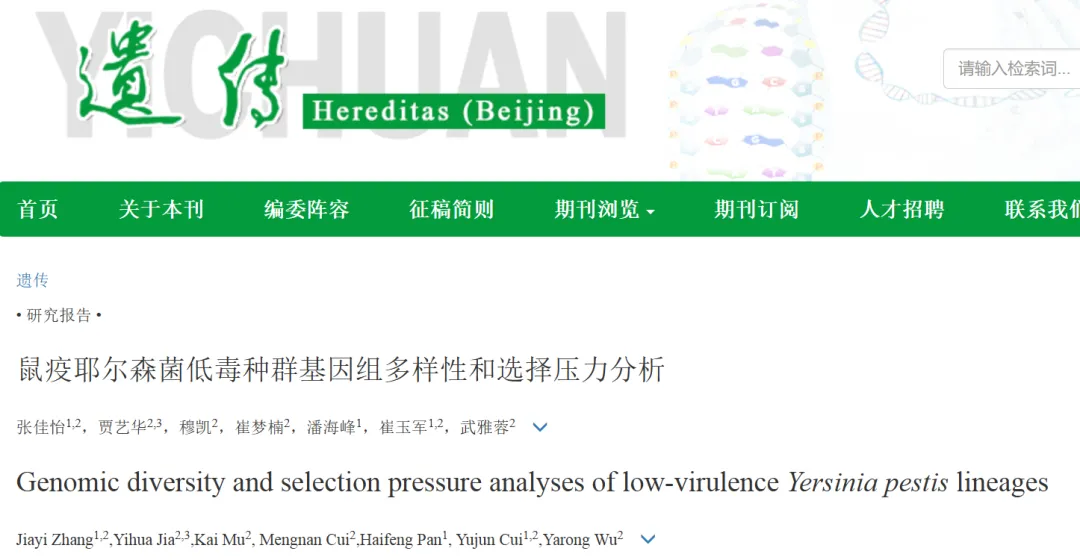 2026 年 2月27日,军事科学院军事医学研究院崔玉军课题组在《遗传》杂志上发表了题为“鼠疫耶尔森菌低毒种群基因组多样性和选择压力分析”的研究论文。该研究整合我国历年监测数据及公共数据库中来自其他国家和地区的鼠疫菌基因组序列,重建了全球范围内鼠疫菌低毒种群的精细系统发育拓扑结构和时空分布特征,揭示了其进化过程中的关键基因组变异和选择压力信号,为鼠疫监测、溯源与毒力演化机制研究提供了重要参考。