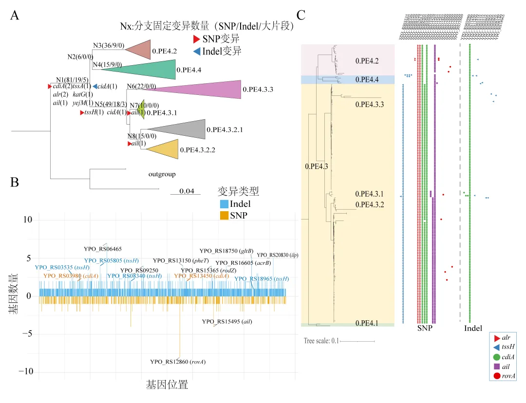 A:鼠疫菌低毒种群菌株中鉴定的分支固定变异。B:鼠疫菌低毒种群菌株中鉴定的高频突变基因或基因家族。C:高频突变基因或基因家族在鼠疫菌低毒种群菌株中的分布。