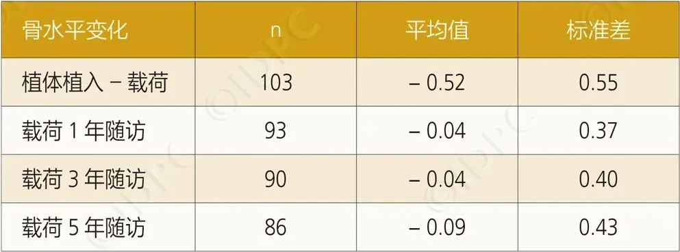 表3显示了从种植体植入到负重后5年的平均骨水平变化。从手术到负重,可明显观察到种植体周围骨重建,平均值为−0.52±0.55mm。从负重到5年随访,平均骨水平变化保持稳定(−0.09±0.43mm)(图3)。