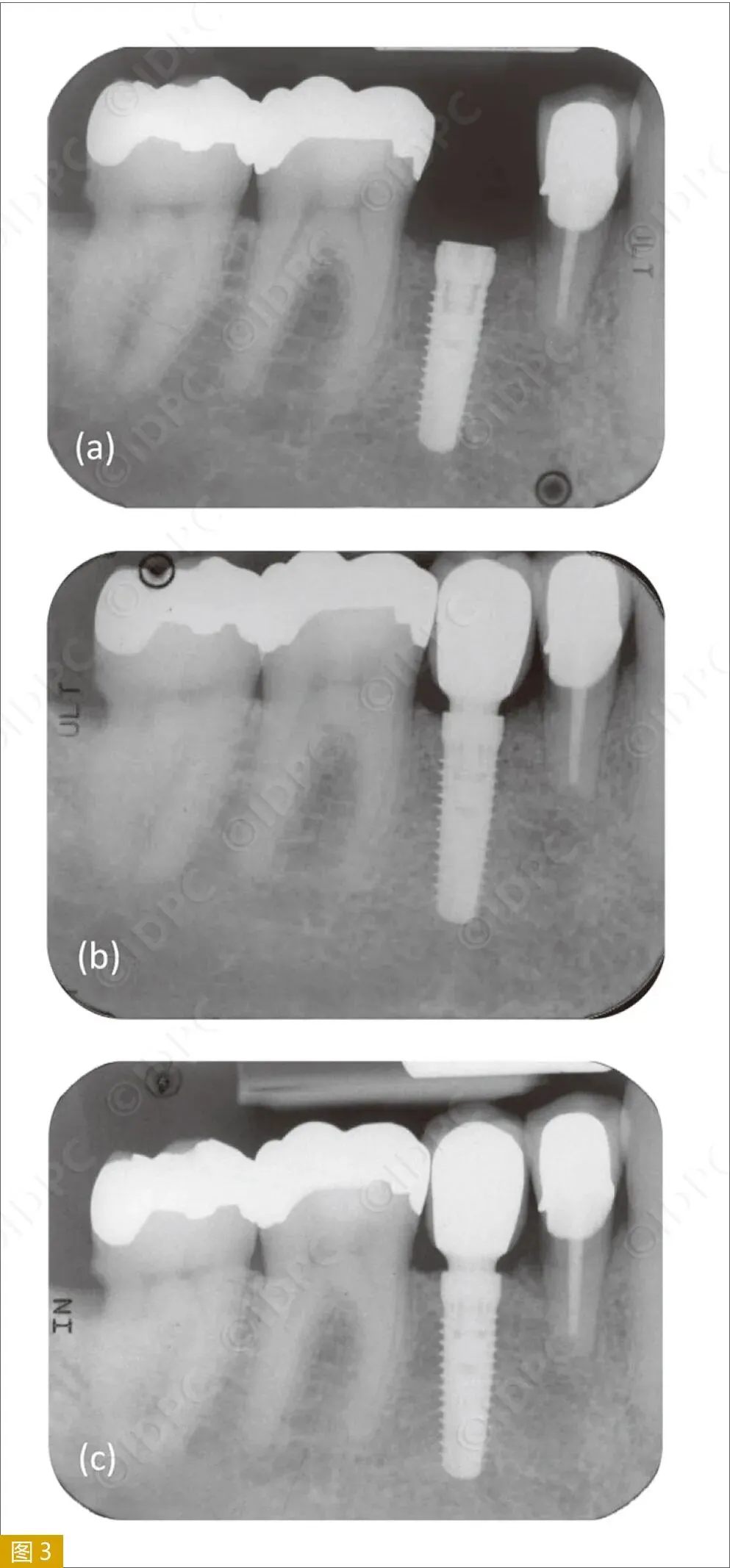 图3:种植体周围骨水平变化的标准根尖片:(a)种植体植入后;(b)载荷后(基台、冠戴入后);(c)载荷5年后。