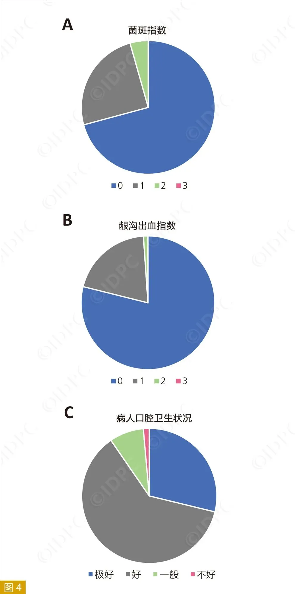 5年后的口腔卫生状况如图4所示。每次随访检查后,研究者根据患者的口腔维护状况、牙石和牙菌斑对患者的整体口腔状况进行主观评估。种植前口腔卫生状况为:31.9%的患者极好,66.0%的患者良好,2.1%的患者一般。在最后一次随访中,28.8%的患者口腔卫生状况极好,61.6%为良好,8.2%为一般,而1.4%的患者口腔卫生状况较差。患者在载荷5年后极好的口腔卫生状况与菌斑和龈沟出血指数相符:96%的种植体没有或只有少数菌斑(得分0和1),99%的种植体无出血或仅在探测点有孤立的出血点(图4)。