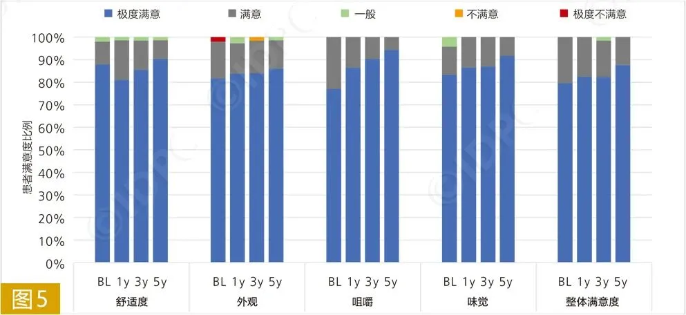 在载荷3年后的随访中,通过满意度量表(1=极度满意,5=极度不满意)测量患者的整体满意度。结果为:82.3%的患者表示极度满意;16.1%的患者表示满意;1名患者(1.6%)表示既不是满意也不是不满意,这是因为种植体周围软、硬组织丧失导致的美观问题。此外,该患者表示对外观不满意(图5)。在第5年的最后一次随访中,所有满意度参数都达到了最大值(总体满意度:87.5%的患者表示非常满意,12.5%的患者表示满意)。