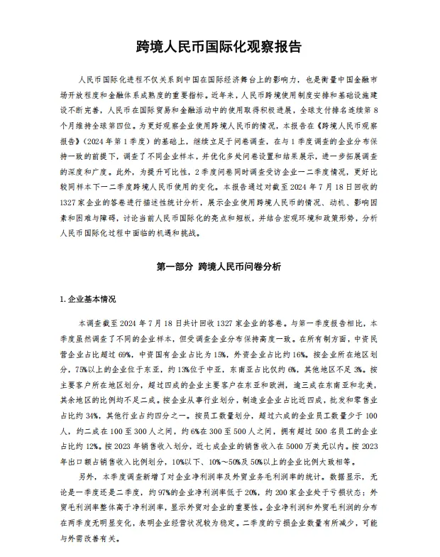 点击《跨境人民币观察报告(2024年第2季度)》可获取完整版,深度洞察企业跨境人民币使用实况!