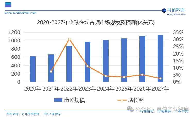 图表3:2020-2027年全球在线音频市场规模及预测(亿美元)