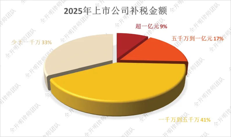 近百家公司暴露问题,补税总额超50亿元补税及滞纳金、罚款总额累计超50亿元。其中,单家公司补税金额最高达7.38亿元(山东黄金),超1亿元的大额补税案例9起,5000万元到1亿元补税案例8起,1000万-5000万元补税案例60起,1000万元以下补税案例24起,呈现“大额案例突出、中小额案例普遍”的分布特征。