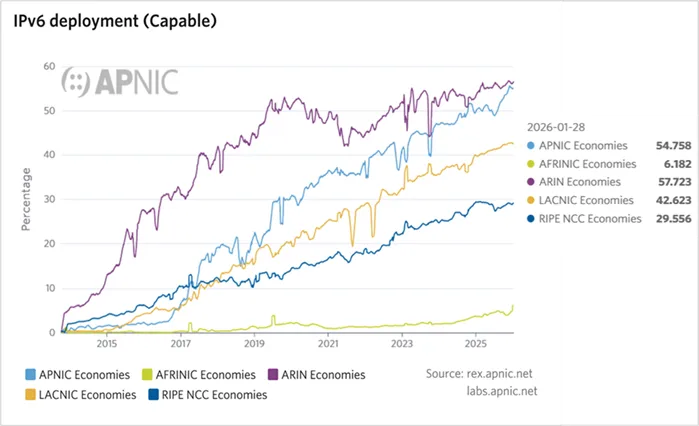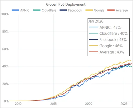 2025年全球IPv6增长格局更趋分散。根据国际互联网协会综合APNIC Labs、Cloudflare、Facebook及Google多维度监测数据,截至2026年1月,全球IPv6部署率达到43%,较去年同期增长1个百分点。