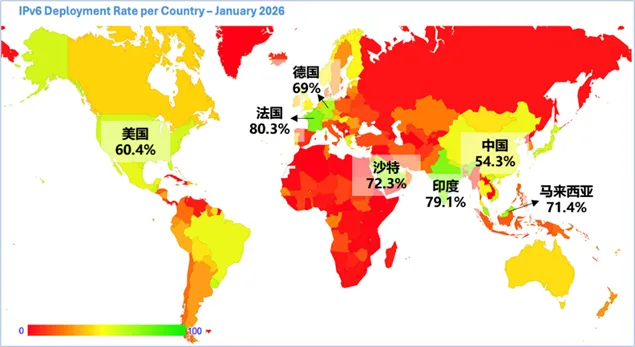 图1 国际互联网协会-2026年1月全球IPv6支持率