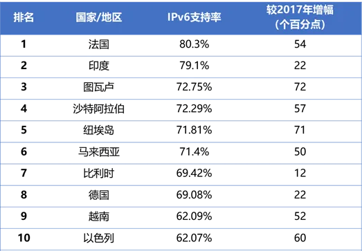 表1 APNIC IPv6支持率TOP10国家(2026年1月)