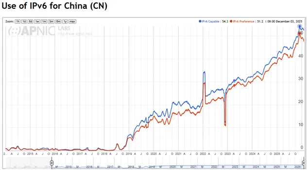 APNIC监测数据显示,我国IPv6支持率从2017年的0.47%攀升至2025年的54.3%,增幅超53个百分点,全球排名跃升至第 28 位。根据国家IPv6发展监测平台,截至2025年12月,全国IPv6终端活跃链接数达18.473亿,占比75%;我国IPv6活跃用户数达8.69亿,位居全球首位。
