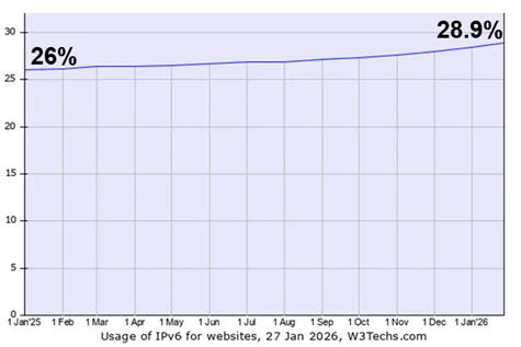 此外,W3Techs机构监测数据显示,截至2026年1月,全球范围内支持IPv6访问的网站占比仅为28.9%。上述两项数据与全球IPv6用户支持率超40%形成鲜明对比,凸显“通路不通车”问题,即网络基础设施改造先行,但内容应用改造滞后的现状。