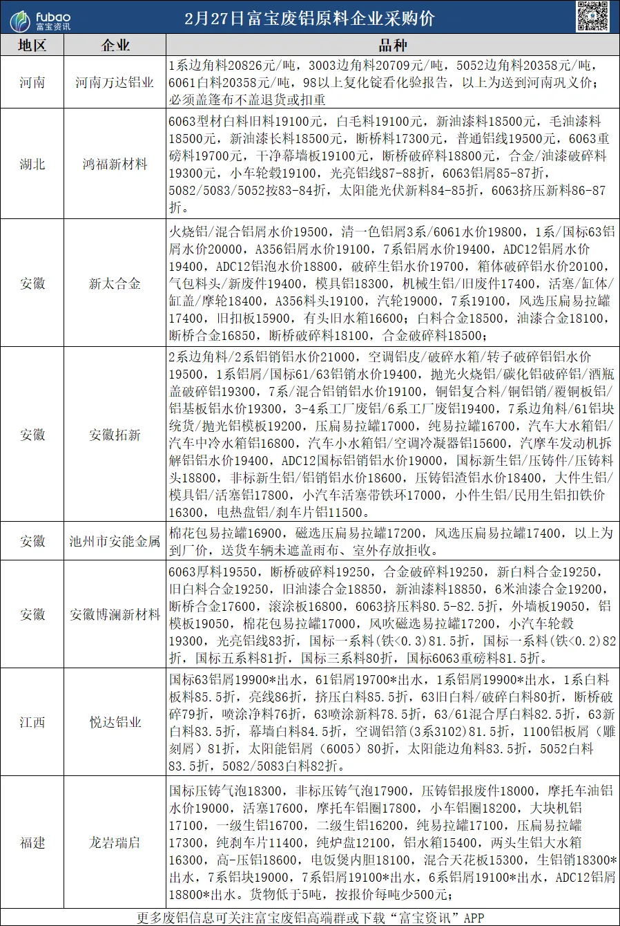 今各地区废铝报价稳中小跌,华东地区光亮铝线报19700-20600元/吨,铝合金白料17800-19400元/吨,企业陆续开工,市场交易逐渐恢复,但整体成交量有限,流通货源偏紧,带票货源畅销,短期铝价高位震荡,废铝价仍易涨难跌。