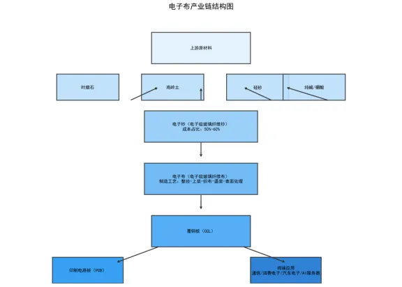 电子布处于电子产业链的上游位置,形成了从原材料到最终应用的完整产业链条。电子布产业链上游为原材料行业,主要包括叶腊石、高岭土、方解石、硼钙石、硅砂等矿物原料,以及纯碱、硼酸等化工原料。这些原料经过配比、熔制、拉丝等工艺制成电子级玻璃纤维纱(电子纱)。产业链中游为电子纱和电子布的制造环节。产业链下游为覆铜板(CCL)制造和印制电路板(PCB)制造,最终应用于各类电子产品。