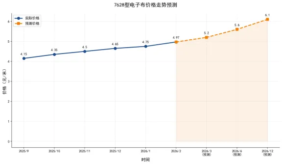 2024年以来,电子布行业供需格局持续趋紧,推动产品价格不断上涨。自2025年8月起,国内高端电子布价格已累计上涨15%以上。以7628型电子布为例,价格从2025年9月底的4.15元/米涨至2026年1月的4.75元/米,随后继续上涨至4.97元/米,9个月价格涨幅达到33%。业内普遍执行"一月一调"的定价机制,显示出市场供需紧张的态势。
