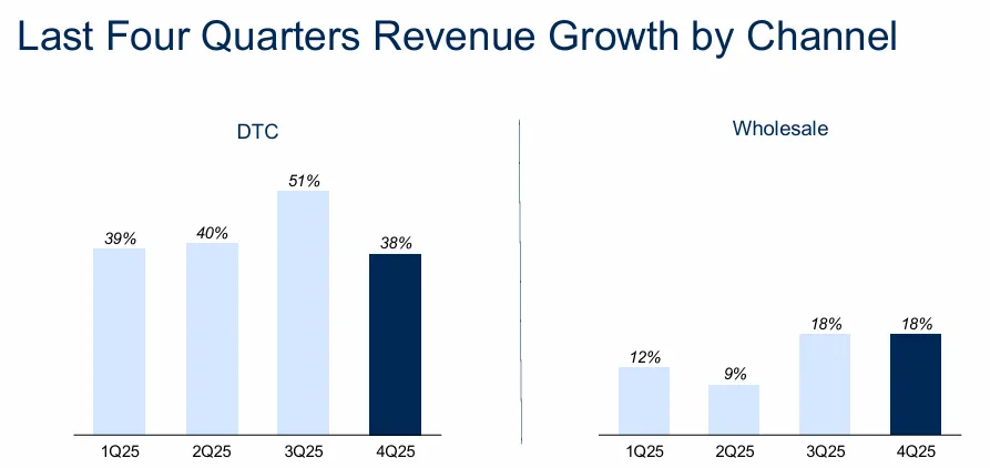 与此同时,DTC营收增速放缓。安踏集团在对亚玛芬私有化后,随即对其DTC改造。大中华作为先行区域,DTC成为了始祖鸟的主要销售渠道。但在2025年第四季度,户外功能性服饰部门直营同店同比收入增长仅为16%,低于第三季度的27%,这一数据直接导致DTC增速回落至38%,低于前三个季度的39%、40%和51%。DTC模式的增长乏力,进一步加剧了始祖鸟的业绩压力。