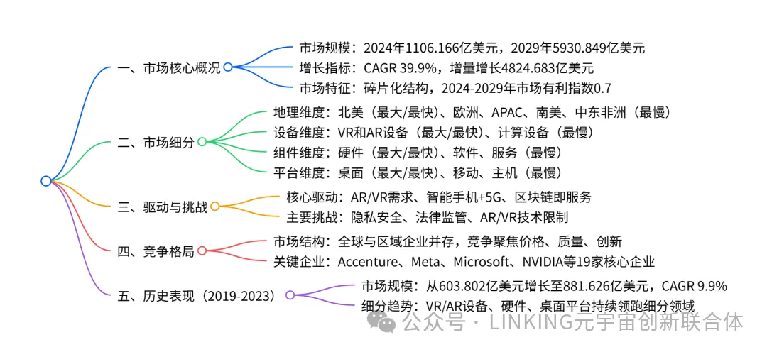 2024-2029 年全球元宇宙市场将保持39.9% 的高复合年增长率,从 2024 年的 1106.166 亿美元增长至 2029 年的 5930.849 亿美元,增量增长达 4824.683 亿美元;市场呈碎片化结构,北美为最大且增长最快的区域市场,VR 和 AR 设备、硬件、桌面平台分别是设备、组件、平台维度的最大及增长最快细分领域,驱动因素包括 AR/VR 技术需求增长、智能手机普及与 5G 应用、区块链即服务兴起,同时面临隐私安全、法律监管及技术限制等挑战,市场竞争集中于产品价格、质量与创新。