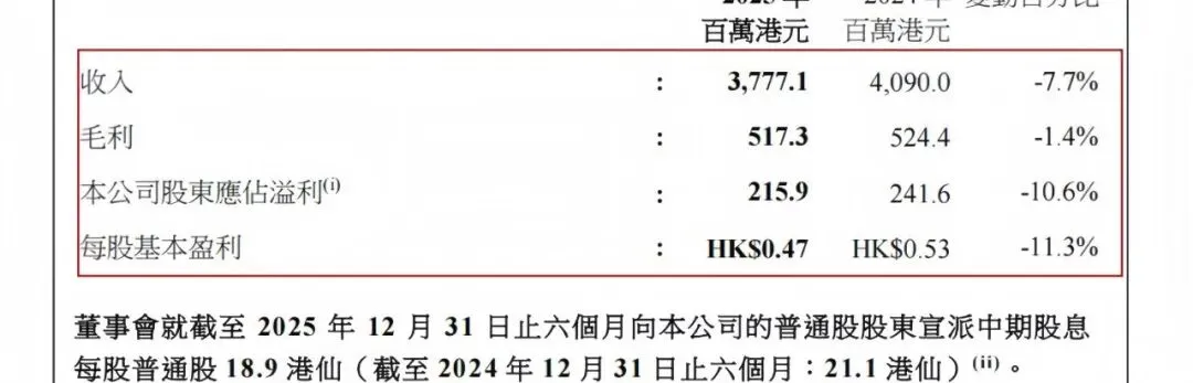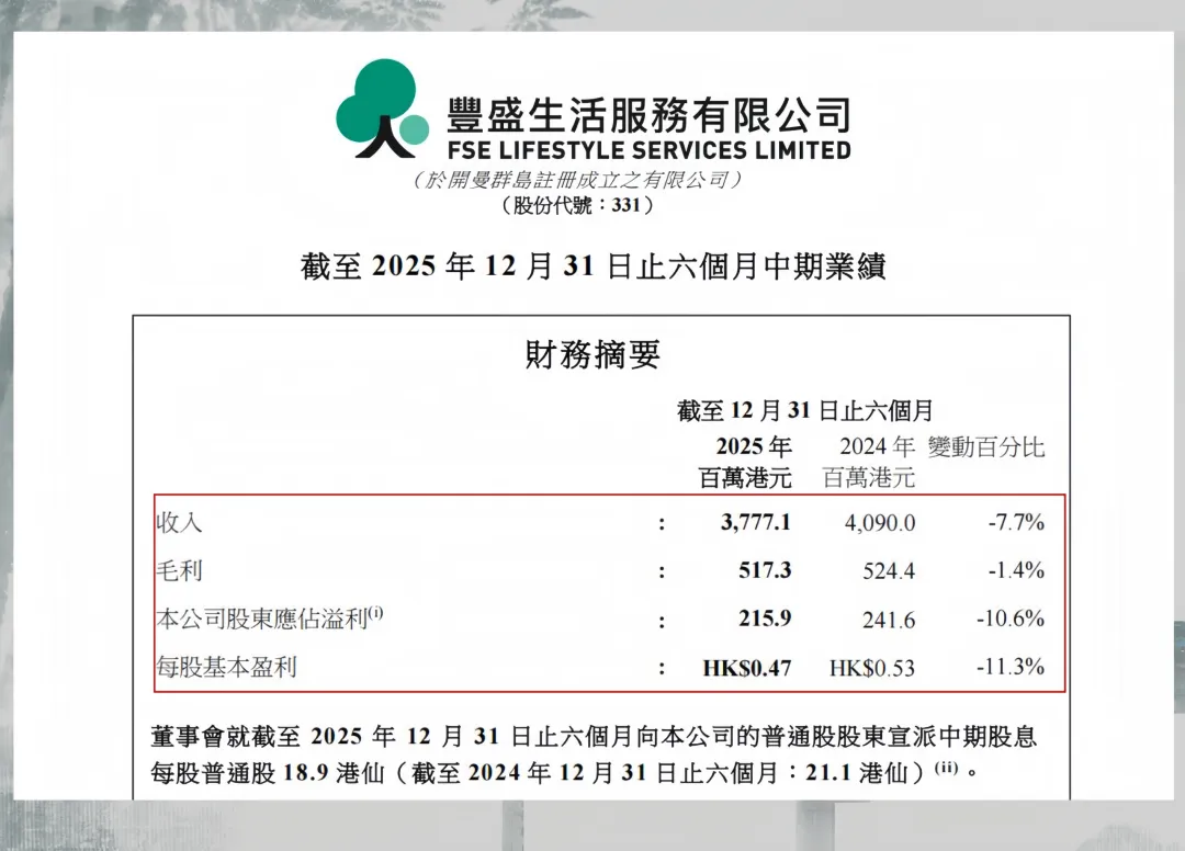 财报显示、公司实现收入 37.77 亿港元,同比下降 7.7%;毛利 5.173 亿港元,同比小幅下降 1.4%,但整体毛利率提升至 13.7%,较上年同期的 12.8% 有所改善。公司股东应占溢利 2.159 亿港元,同比下降 10.6%;基本每股盈利 0.47 港元,低于上年同期的 0.53 港元。可能会有人问,为什么营收大幅度降低,毛利降低,但是毛利率却上升呢?“收入下滑但毛利率回升”的组合,通常指向两种情况:要么公司主动优化订单与客户结构、严控成本。要么高毛利业务板块占比提升——丰盛生活服务显然属于后者。因为其盈利承压主要集中在机电工程服务板块,而城市刚需服务与物业及设施管理的贡献持续增强,成为支撑毛利率改善的核心力量。公司在公告中也明确说明,利润下滑主要是受机电工程服务贡献减少及政府补助取消的影响。这里有一个需要注意的“可比口径”细节:2024 年同期公司获得政府补助 160 万港元,而本期补助为 0;若剔除这一因素影响,公司披露的“经调整净利润”同比下降约 10.0%。这也说明,利润下滑并非来自一次性费用激增,更多是工程业务结算节奏与行业盈利空间变化带来的周期性扰动,而非公司经营出现实质性失速。股东回报方面,董事会宣布派发中期股息每股 18.9 港仙,较上年同期的 21.1 港仙有所下调,按公司披露口径计算,对应派息率约 40.2%,仍保持了相对稳健的分红水平。从收入结构来看,公司三大业务分部在本期的表现呈现明显分化:物业及设施管理服务:实现收入 3.536 亿港元,同比微增 0.9%,保持稳定。城市刚需服务(对应公司披露口径“City Essential Services”,即原文提及的“综合生活服务”)--实现收入 23.895 亿港元,同比增长 3.2%,成为唯一保持稳健增长的板块。机电工程服务(E&M Services)实现收入 10.340 亿港元,同比大幅下滑 27.4%,这将成为拖累集团整体收入的主要因素。这组数据背后,最核心的变化是:城市刚需服务的增长进一步提升了其收入占比,有效对冲了机电工程服务下滑的影响。据公司管理层讨论与分析披露,本期集团收入同比减少 3.129 亿港元,其中仅机电工程服务就减少 3.908 亿港元,而城市刚需服务与物业及设施管理分别增加 0.747 亿港元与 0.032 亿港元,成功抵消了部分降幅。利润贡献的分化同样显著。根据公司新闻稿披露,计入政府补助口径下,三大分部的利润贡献分别为:物业及设施管理服务 4590 万港元(同比 +1.8%)、城市刚需服务 1.189 亿港元(同比 +0.9%)、机电工程服务 6010 万港元(同比 -32.6%)。这意味着,集团利润的压力几乎全部集中在机电工程服务板块,另外两大板块则基本维持增长或稳定,成为利润的“压舱石”。进一步拆解毛利结构可以发现:本期三大分部毛利分别为物业及设施管理 1.074 亿港元、城市刚需服务 2.742 亿港元、机电工程服务 1.357 亿港元。其中,城市刚需服务毛利率提升至 11.5%,较上年同期的 10.8% 有所改善;物业及设施管理毛利率持续维持在 30% 以上的高位,盈利能力突出。机电工程服务毛利率虽为 13.1%,但受收入基数大幅下滑影响,其对集团整体毛利的绝对贡献明显下降。公司对机电工程板块的下滑是怎么解释的呢?公告显示核心指向“香港市场设计及建造项目普遍延误、大型项目落成受阻”。