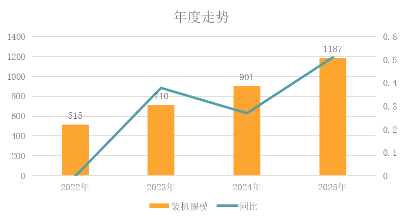 从SNE 数据来看,全球动力电池行业规模呈现持续扩张态势:年度装机规模从2022年的515 GWh增长至2025年的1187GWh,三年间实现翻倍以上增长,同比增速虽在2024年有所回落至约66%,但2025年又回升至约132%,显示出强劲的增长动能。