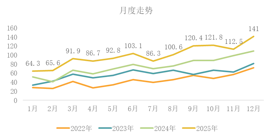 月度维度上,2022-2025年各年装机量均呈现逐月抬升的趋势,日2025年全年各月装机规模显著高于前三年,12月单月装机量已达141GWh,反映出行业在新能源汽车渗透率提升与储能需求爆发的双重驱动下,整体景气度持续上行。