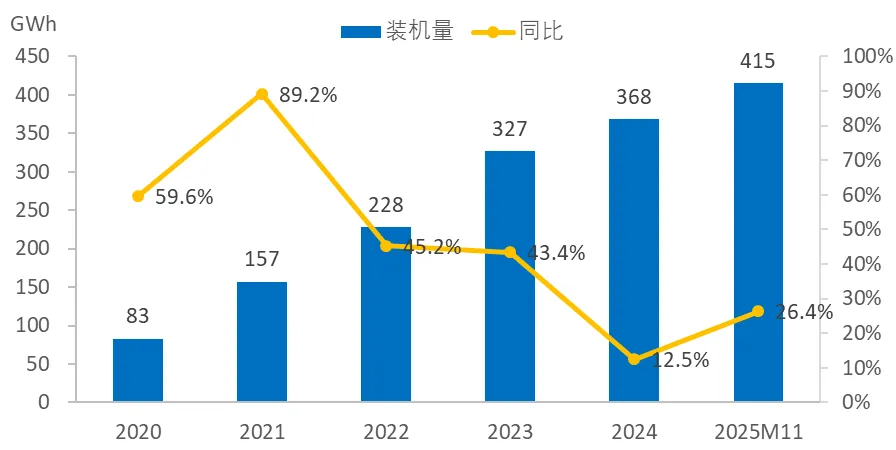 根据SNE数据,海外动力电池行业规模呈现波动增长态势:年度装机量从2020年的83GWh提升至2025年前11个月的415GWh,期间同比增速在2021年达到峰值89.2%,2024年虽回落至26.4%,但整体仍保持扩张。