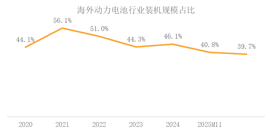 从海外装机占比来看,2020一2025年海外市场占全球动力电池装机规模的比例在39.7%一56.1%区间波动,2021年占比最高(56.1%),后续虽有所回落但始终维持在 40%左右的水平,显示出海外市场在全球动力电池行业中仍占据重要地位,且随着新能源汽车渗透率提升,其规模扩张具备持续动力。