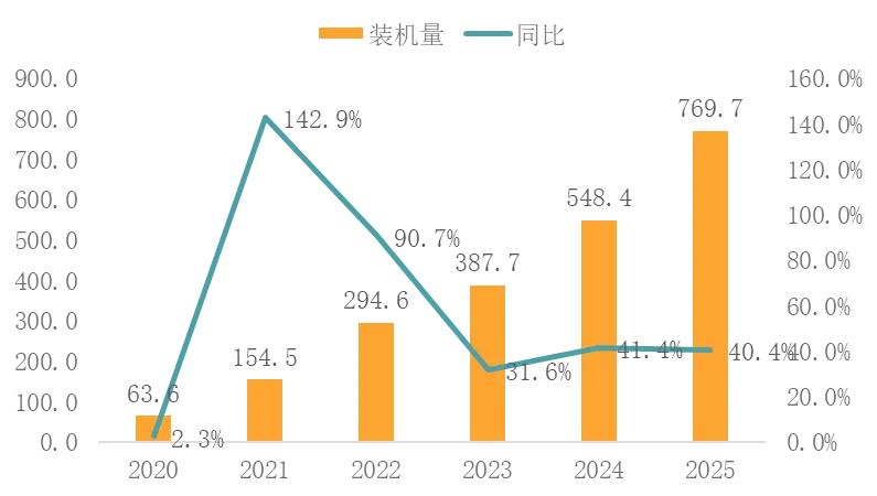 根据 SNE数据,中国动力电池行业规模实现高速增长:年度装机量从2020年的63.6 GWh 快速攀升至2025年的769.7 GWh,五年间增长超11 倍,同比增速在2021年达到峰值142.9%,后续虽有所回落,但2025年仍保持40.4% 的稳健增长。