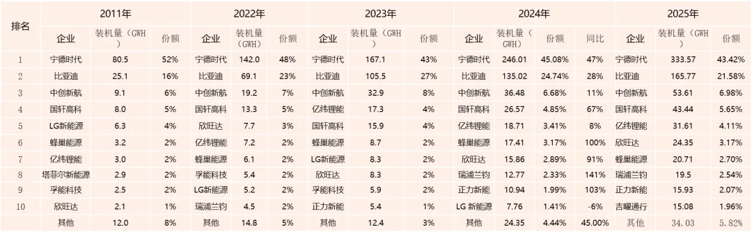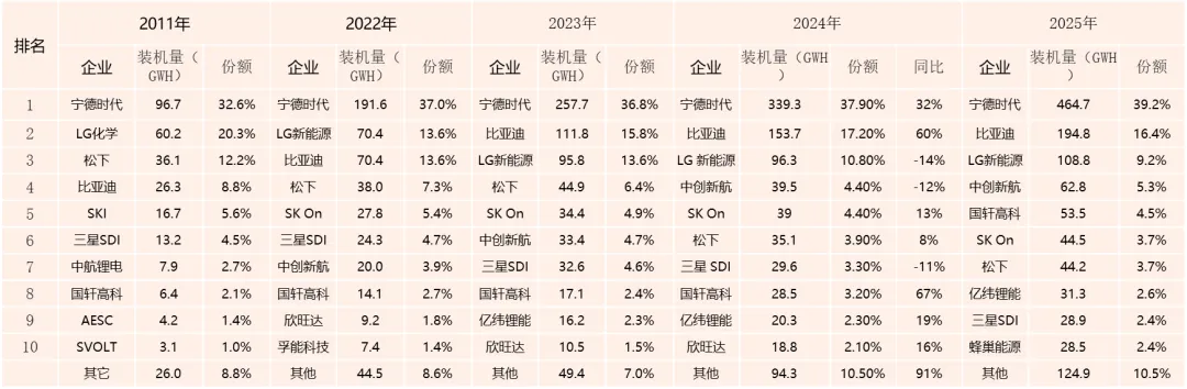 根据SNE数据,全球动力电池企业装机呈格局呈现出明显的头部集中与梯队分化特征:宁德时代自2011年起始终稳居榜首,2025年装机量达464.7GWh,份额提升至39.2%,龙头地位持续强化;比亚迪紧随其后,2023-2025年份额从15.8%提升至16.4%,成为第二极;LG新能源、中创新航、SKOn、国轩高科等企业则在第三至第六位波动,其中中创新航、国轩高科等中国企业凭借产能扩张与海外布局,份额稳步提升,而LG新能源等韩系企业则面临增长压力。整体来看,行业CR10持续提升,2025年头部企业合计份额超89%,市场集中度进一步增强,中国企业在全球竞争中占据主导地位,韩系企业份额有所收缩,行业格局呈现一超一强、多强追赶”的态势。